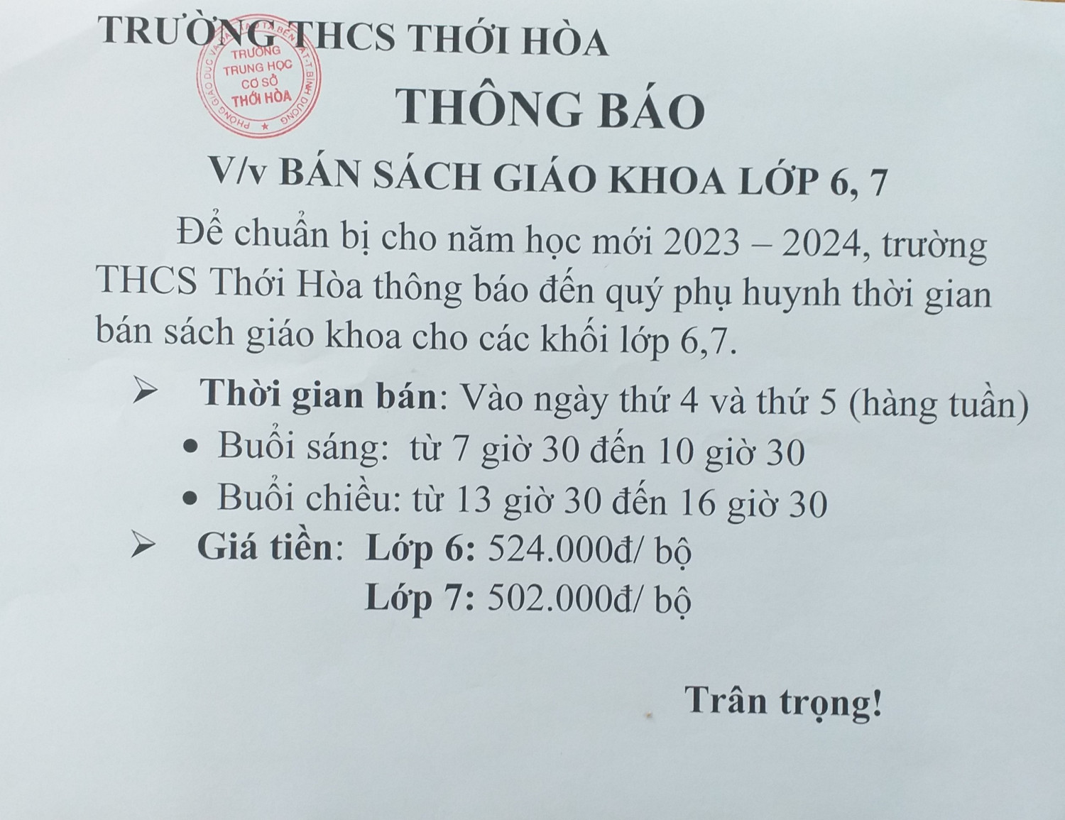 THÔNG BÁO BÁN SÁCH GIÁO KHOA LỚP 6,7