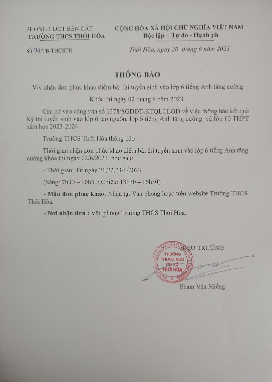Thông báo kết quả thi và việc nhận đơn phúc khảo tuyển sinh lớp 6 Tiếng Anh tăng cường năm học 2023 - 2024