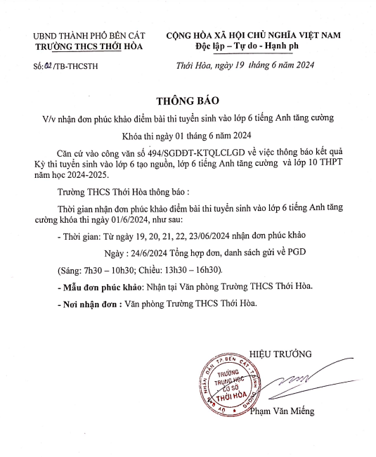Thông báo kết quả thi và việc nhận đơn phúc khảo tuyển sinh lớp 6 Tiếng Anh tăng cường năm học 2024 - 2025