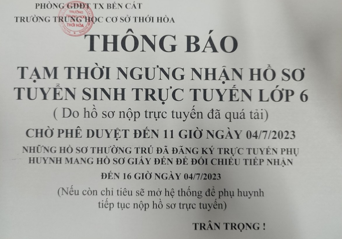 THÔNG BÁO TẠM THỜI NGƯNG NHẬN HỒ SƠ TUYỂN SINH TRỰC TUYẾN LỚP 6